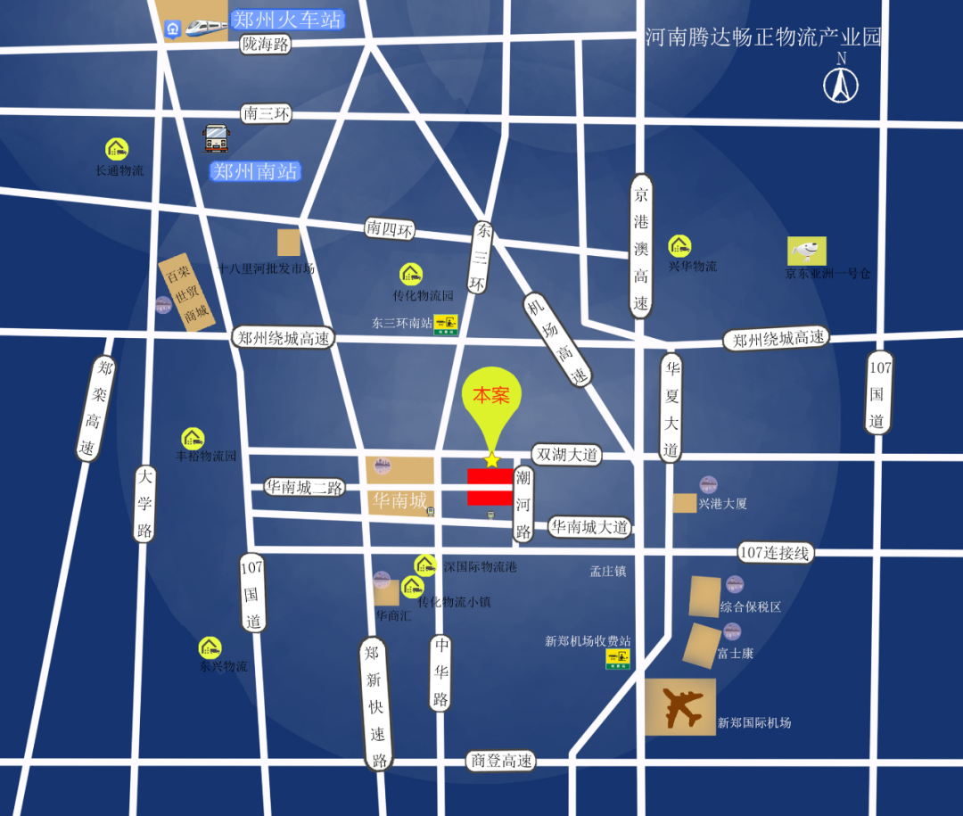 項(xiàng)目位于鄭州市新鄭孟莊鎮(zhèn)潮河路與規(guī)劃二路交匯處,東臨華夏大道、西臨中華路,南臨107連線,北臨雙湖大道,毗鄰華南城商圈,區(qū)位優(yōu)越,交通發(fā)達(dá)。